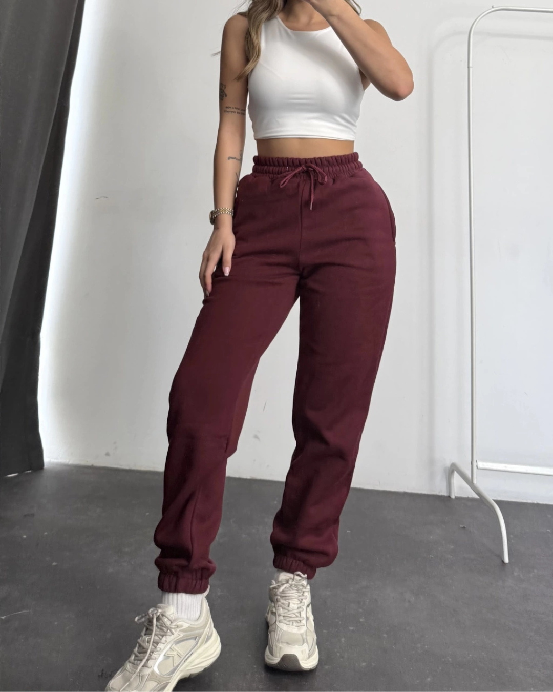 Calças desportivas de algodão com ajuste elástico e estilo folgado para mulher