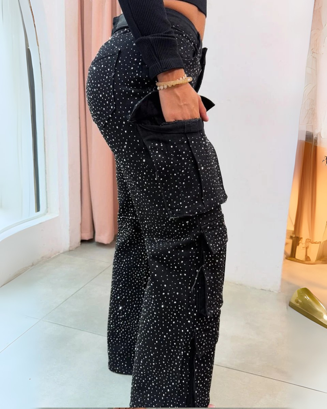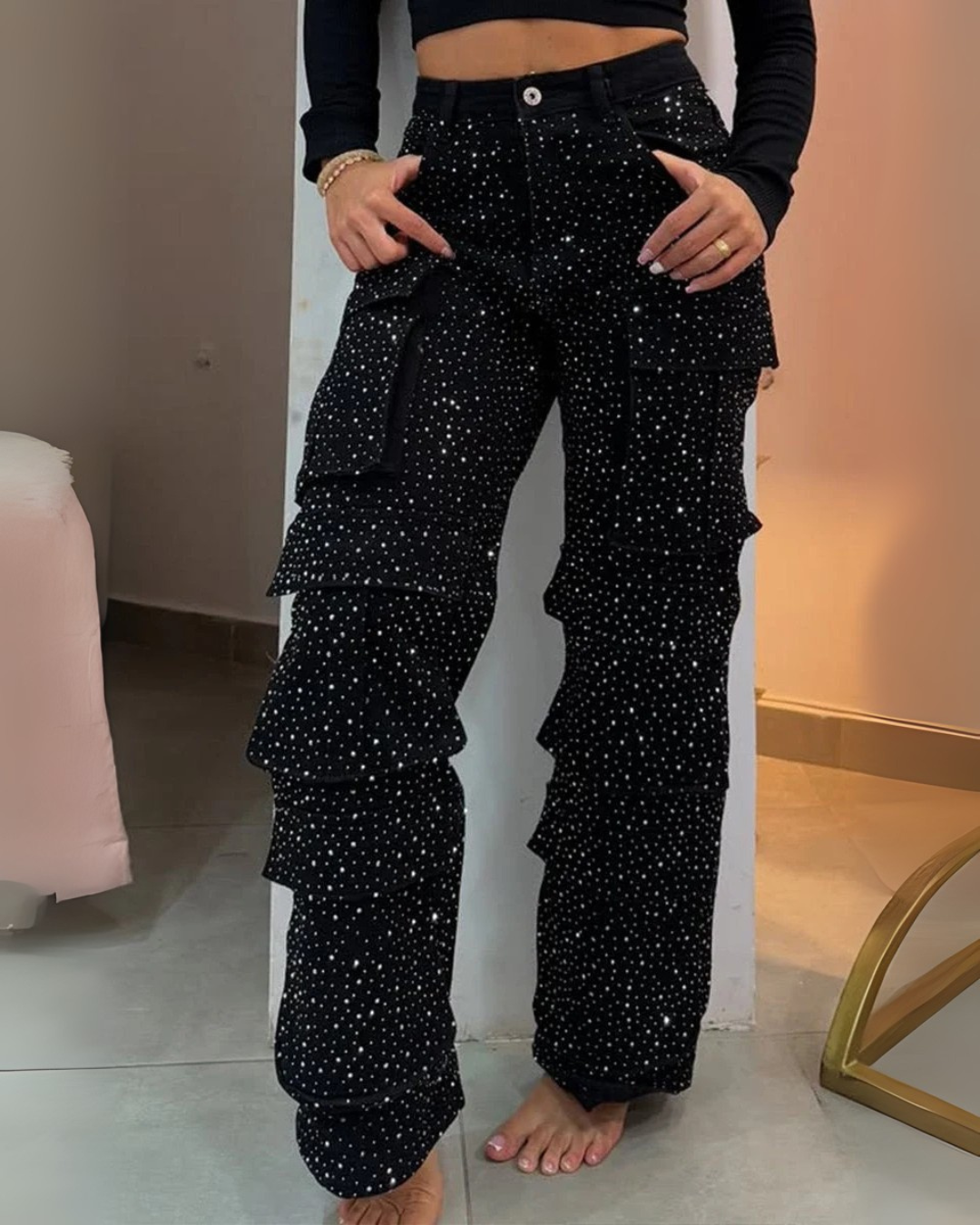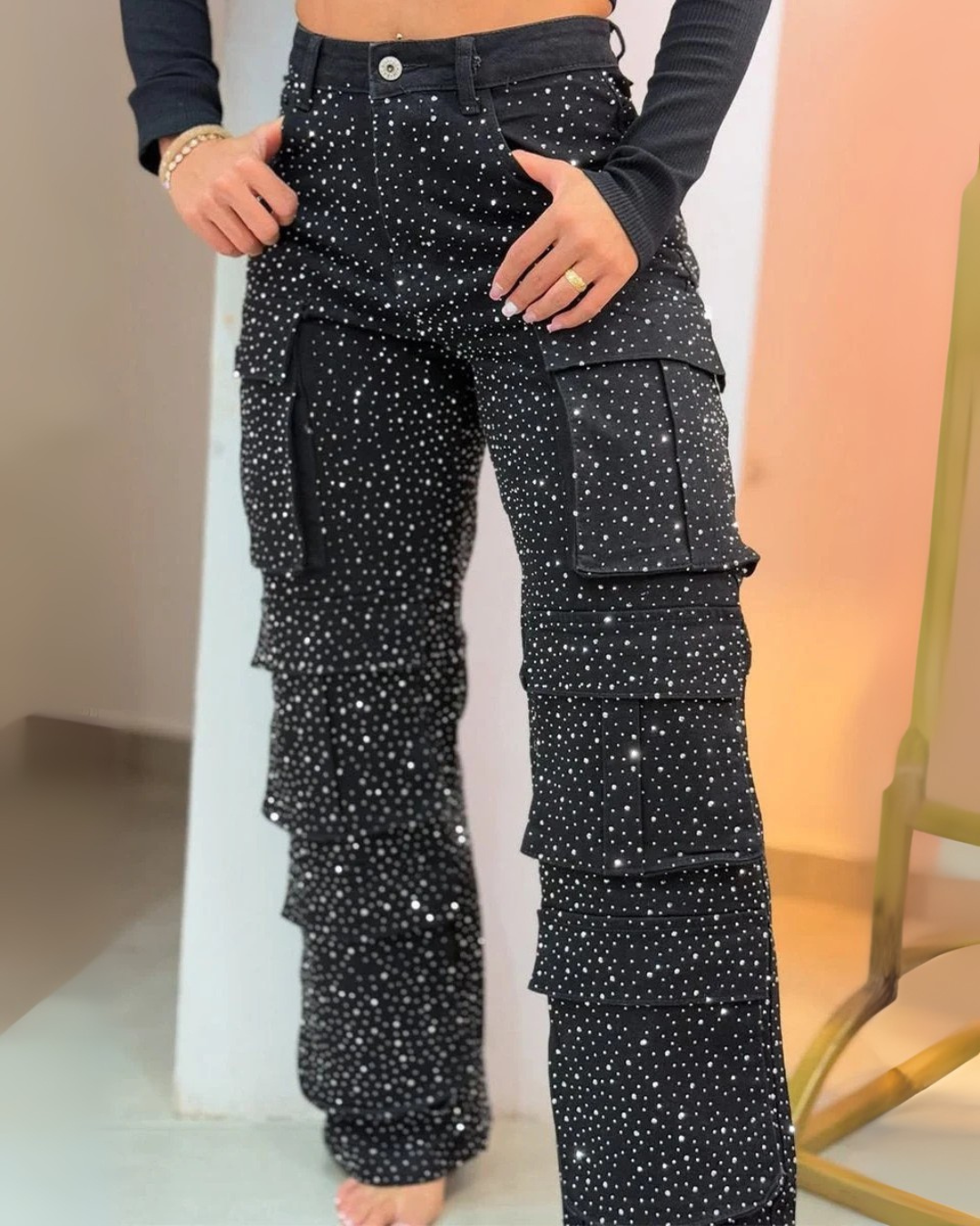 Um equilíbrio perfeito entre o prático e o glamoroso. Os bolsos cargo conferem funcionalidade, enquanto os brilhos subtis e os folhos oferecem um look ousado e feminino.
