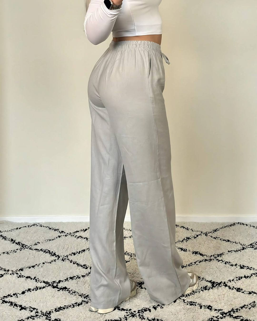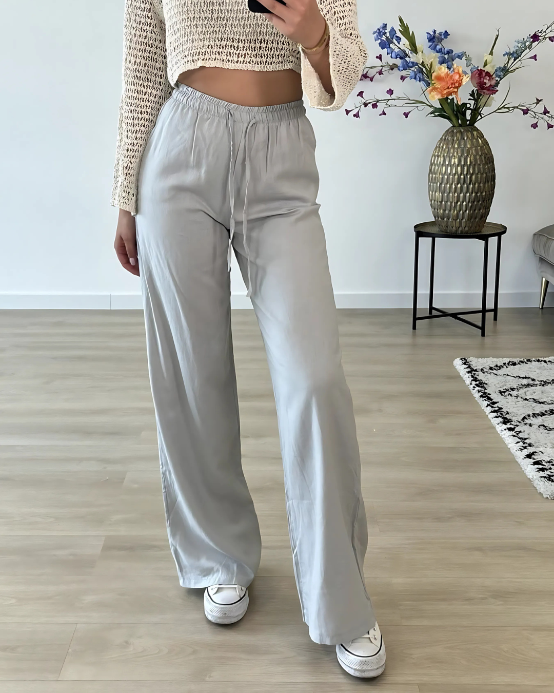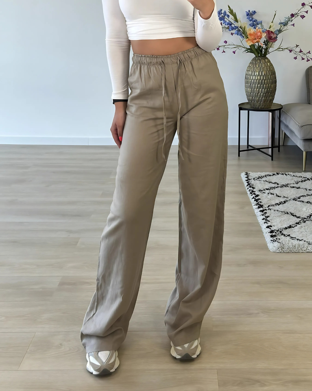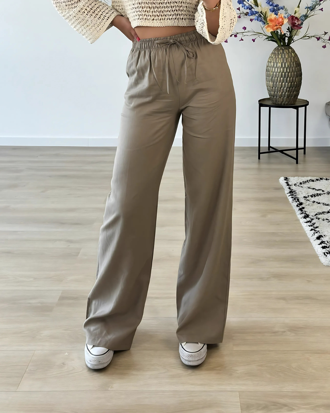A silhueta ampla e o acabamento elegante permitem combinar estas calças tanto com sapatilhas descontraídas quanto com saltos para um look mais refinado.