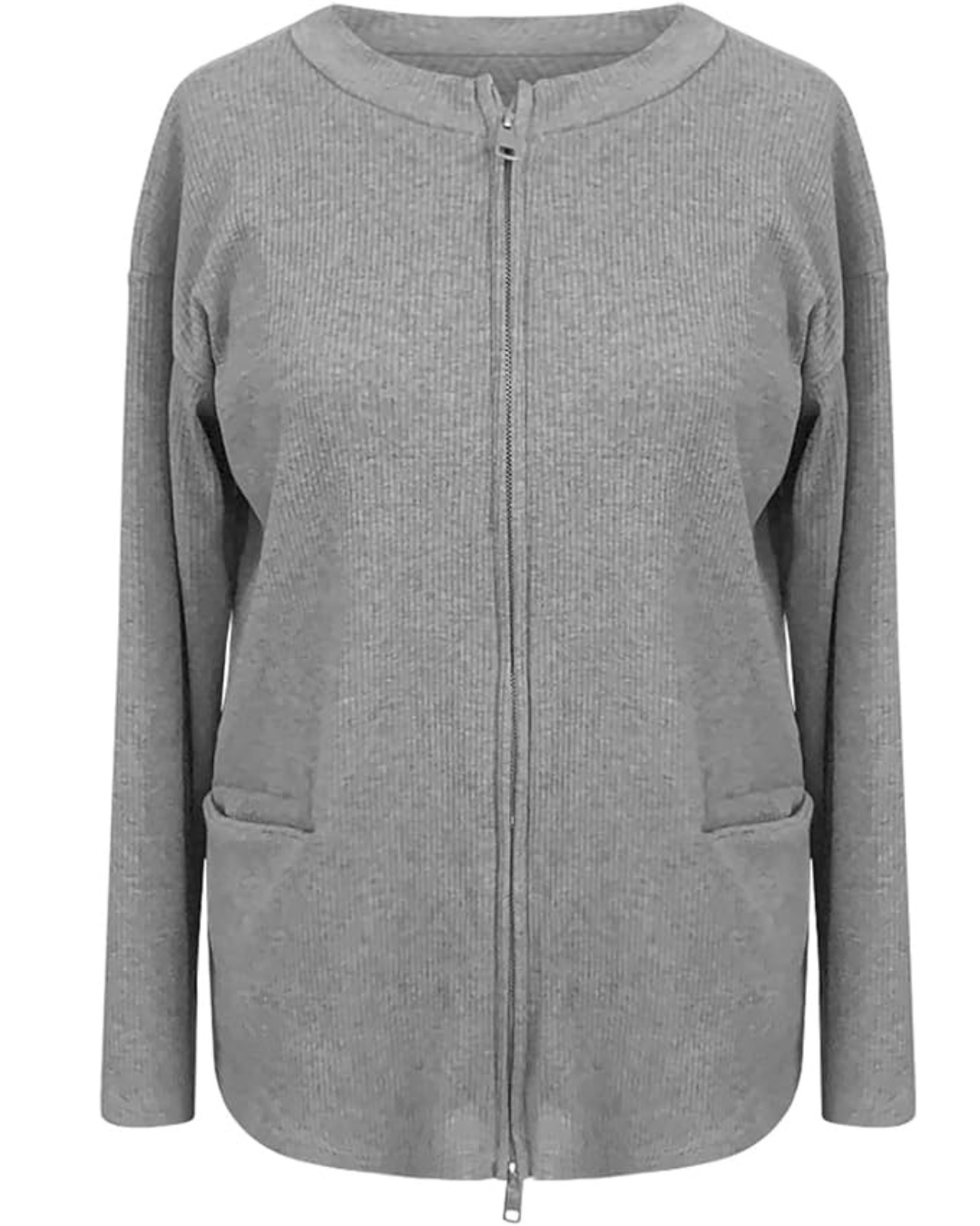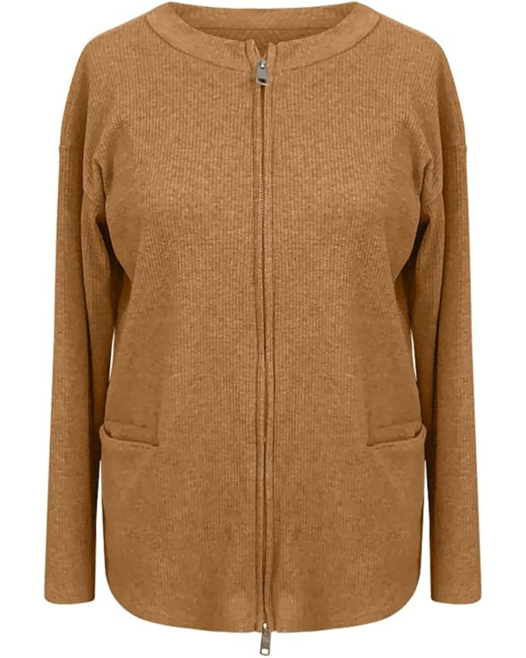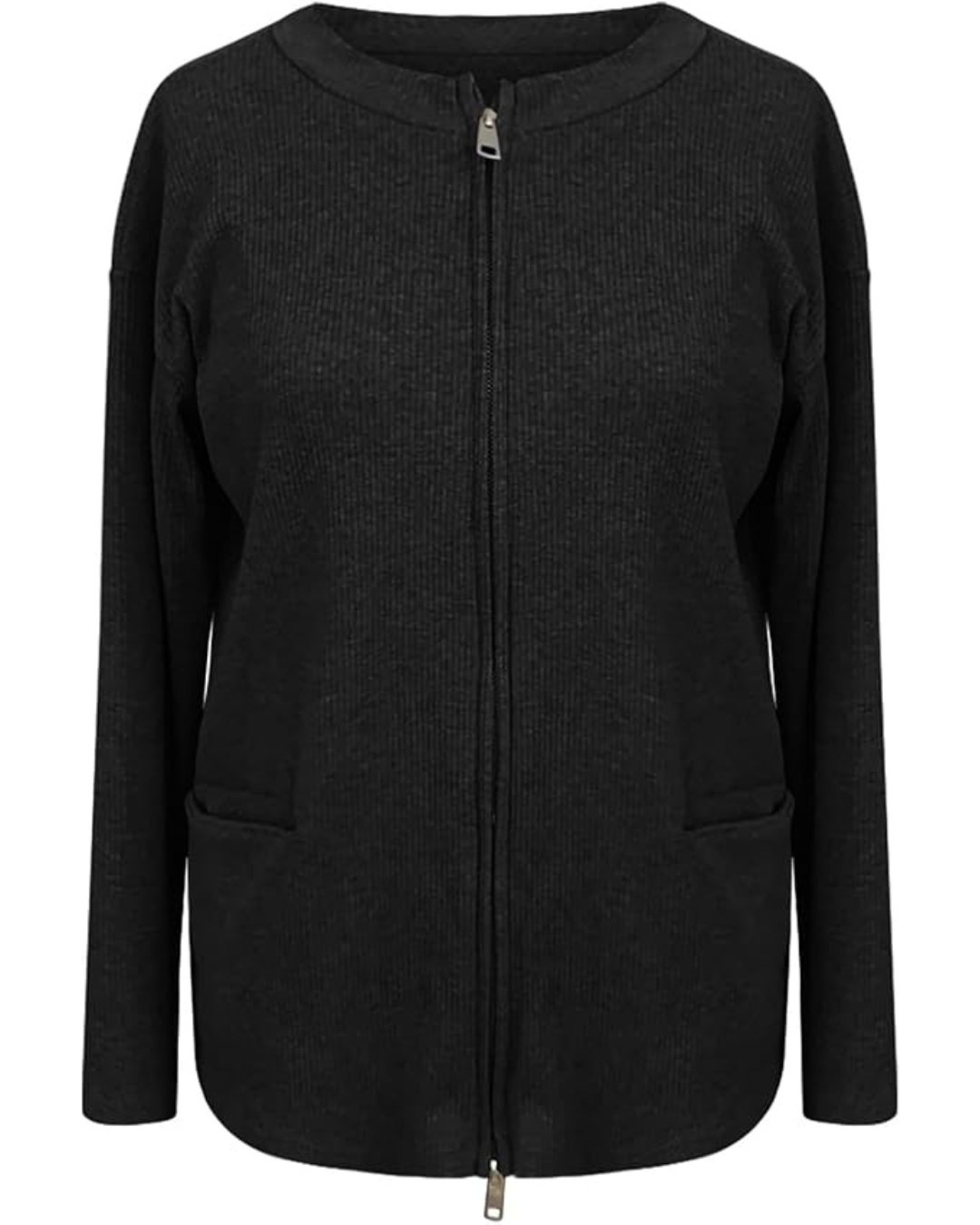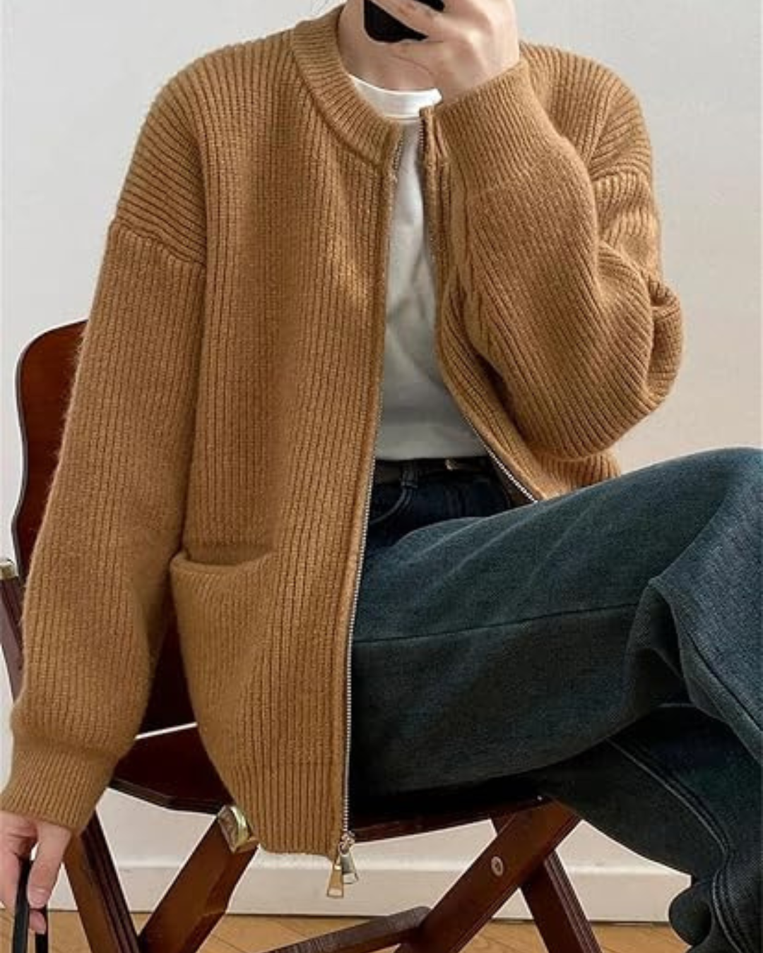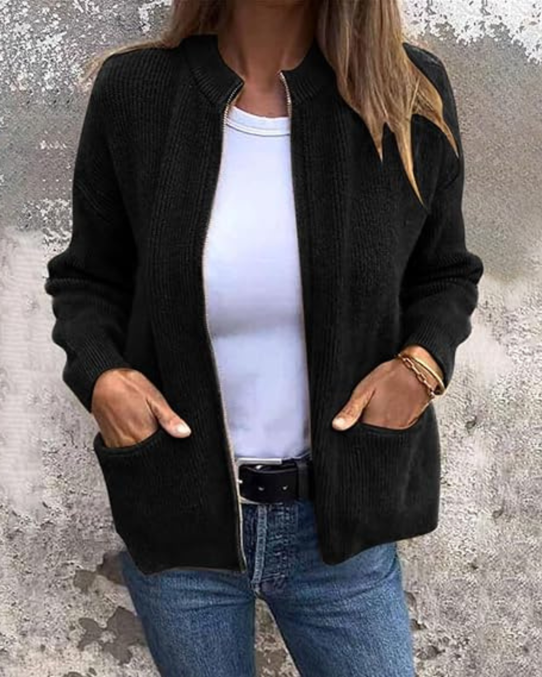 Casaco Curto de Malha Grossa para Mulher com Fecho de Correr e Corte Descontraído