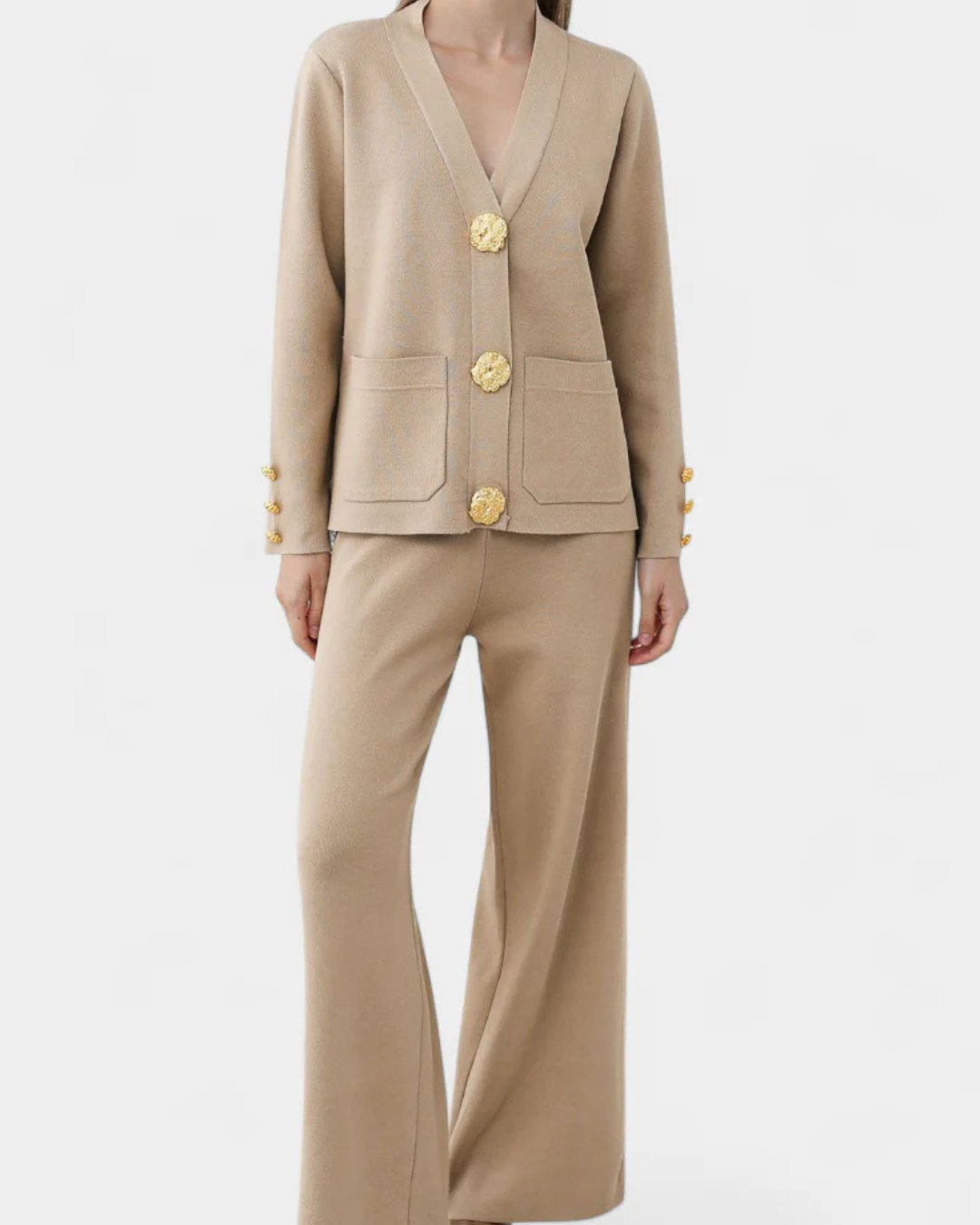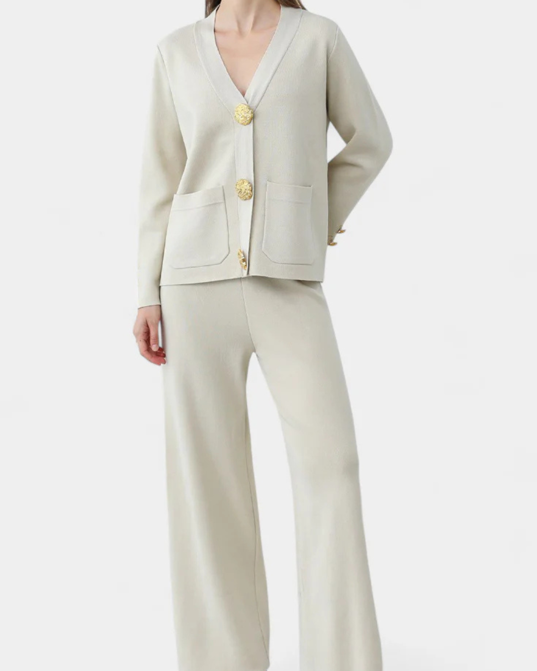 Conjunto de camisola com botões metálicos e calças largas de estilo sofisticado