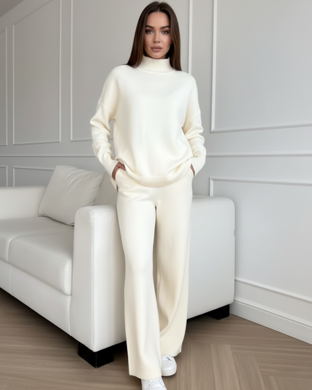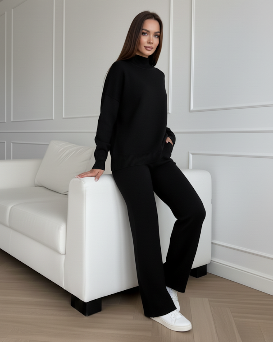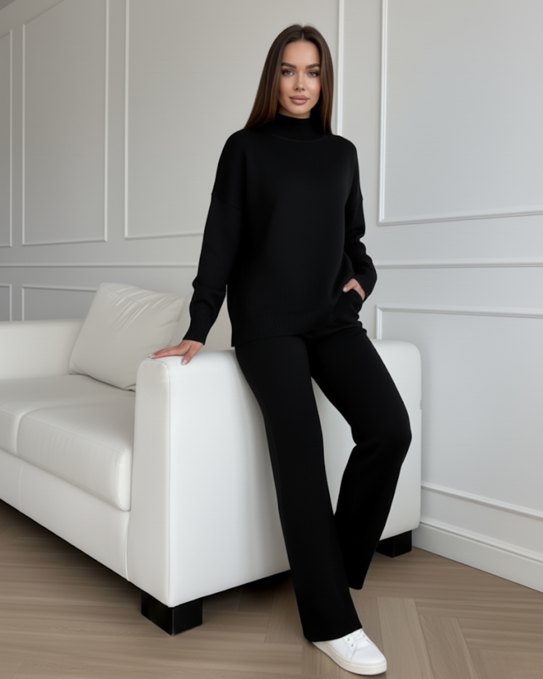 É a definição de elegância e conforto num único look. Confeccionado em malha de primeira qualidade, a textura sofisticada e o ajuste impecável das calças e da camisola de manga comprida garantem uma sensação suave ao toque. É o conjunto perfeito para um look moderno e acolhedor que a fará sentir-se incrível durante todo o dia.