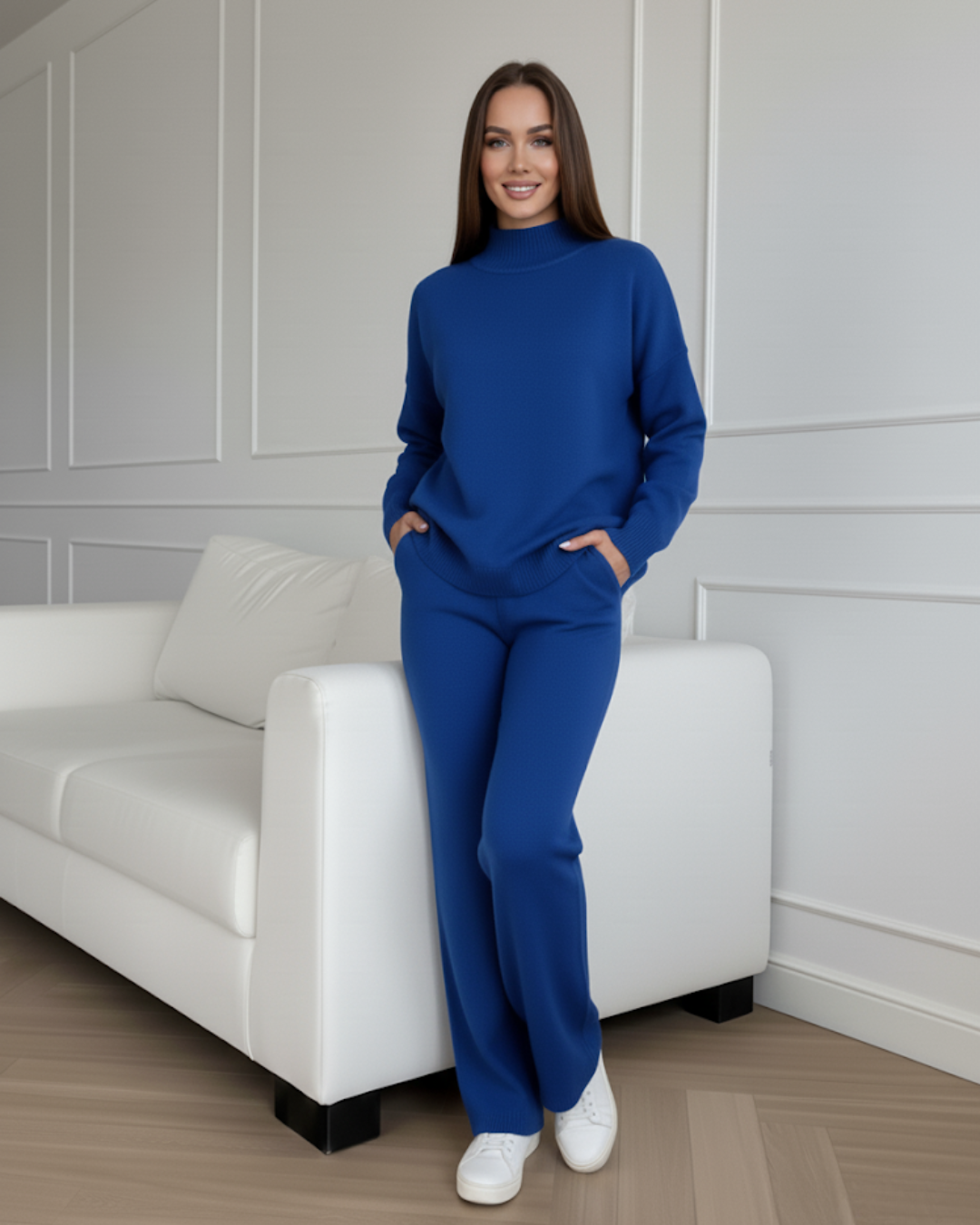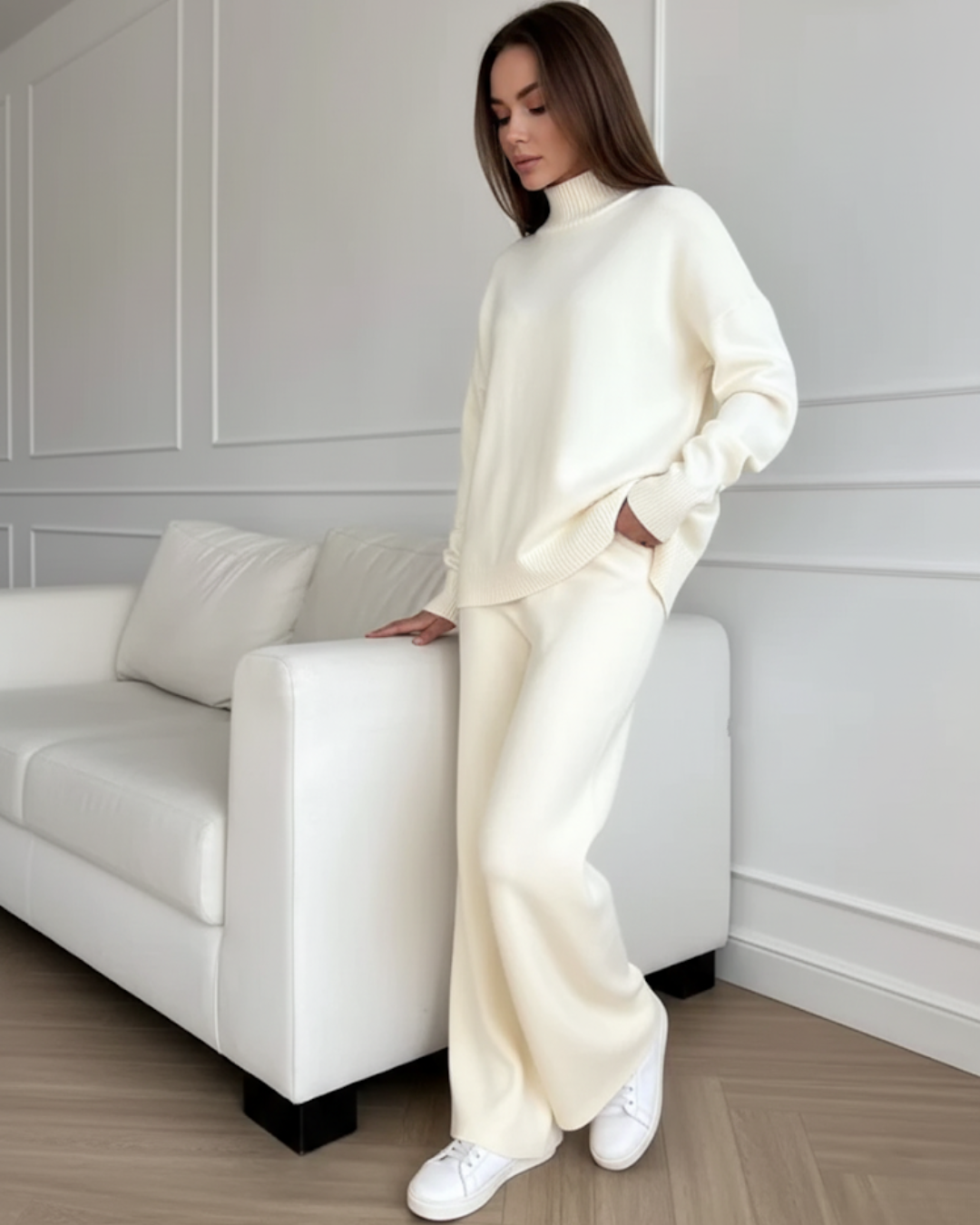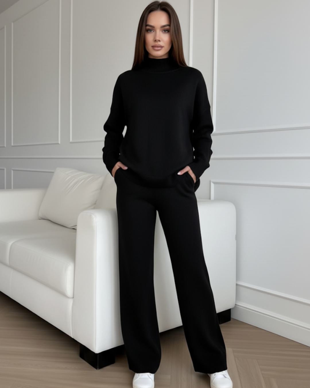 É a definição de elegância e conforto num único look. Confeccionado em malha de primeira qualidade, a textura sofisticada e o ajuste impecável das calças e da camisola de manga comprida garantem uma sensação suave ao toque. É o conjunto perfeito para um look moderno e acolhedor que a fará sentir-se incrível durante todo o dia.