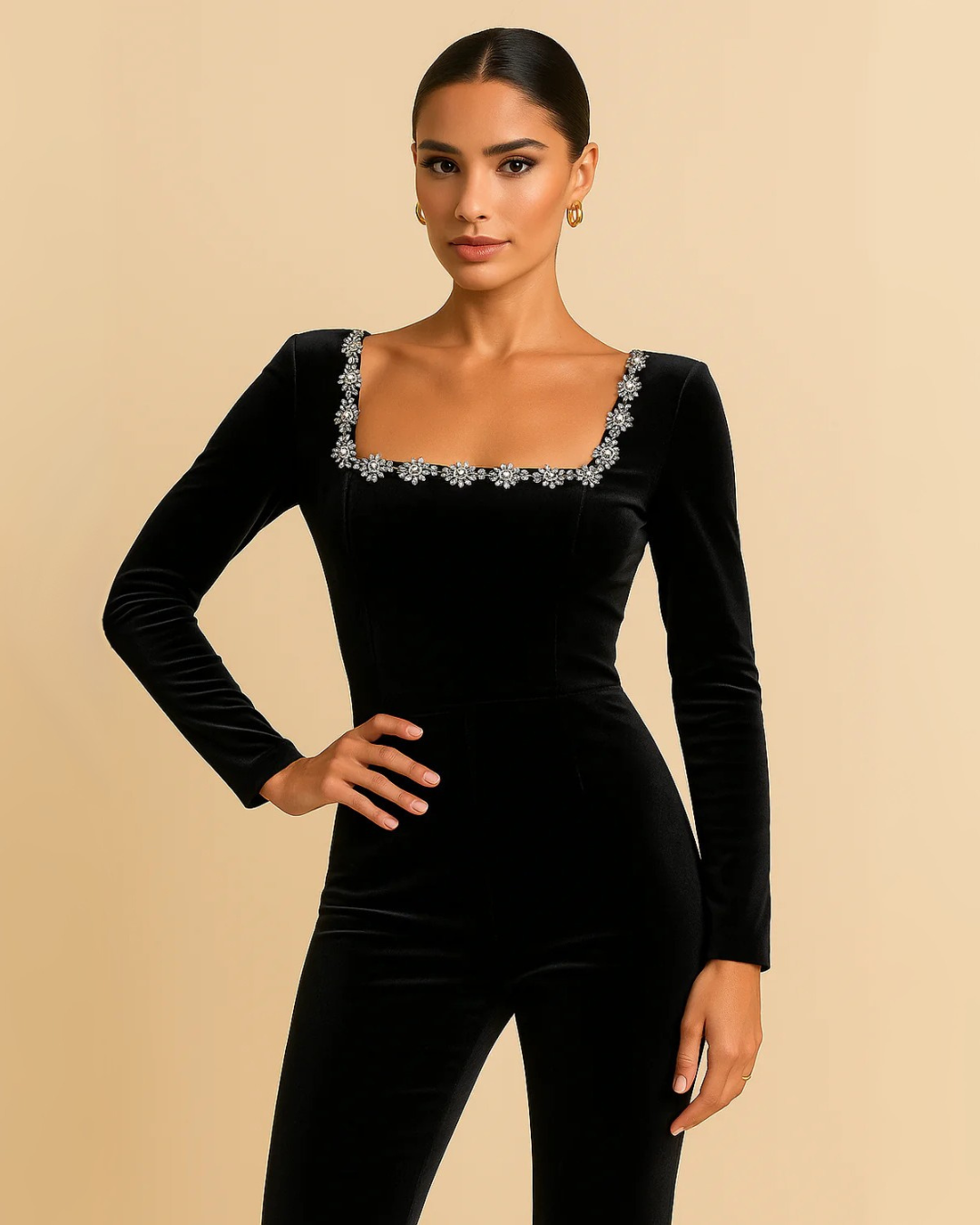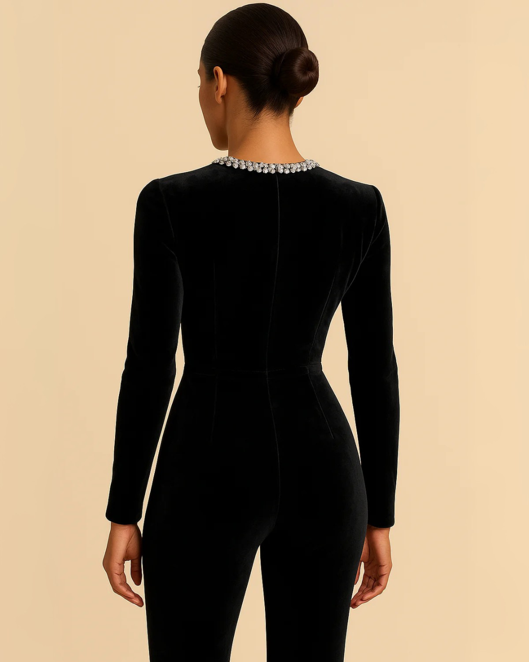 O veludo, por natureza, evoca sofisticação. Combinado com os adornos florais, este macacão torna-se a alternativa perfeita a um vestido de noite. O seu design de peça única oferece um ajuste impecável e um look aerodinâmico, ideal para jantares, casamentos ou festas de cocktail.