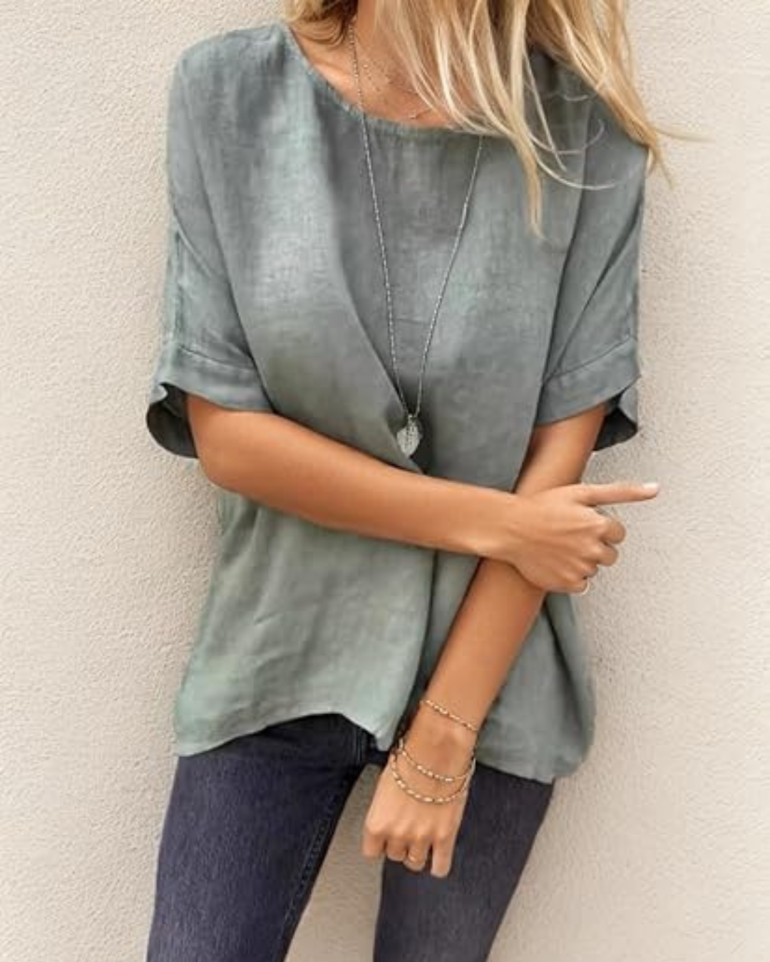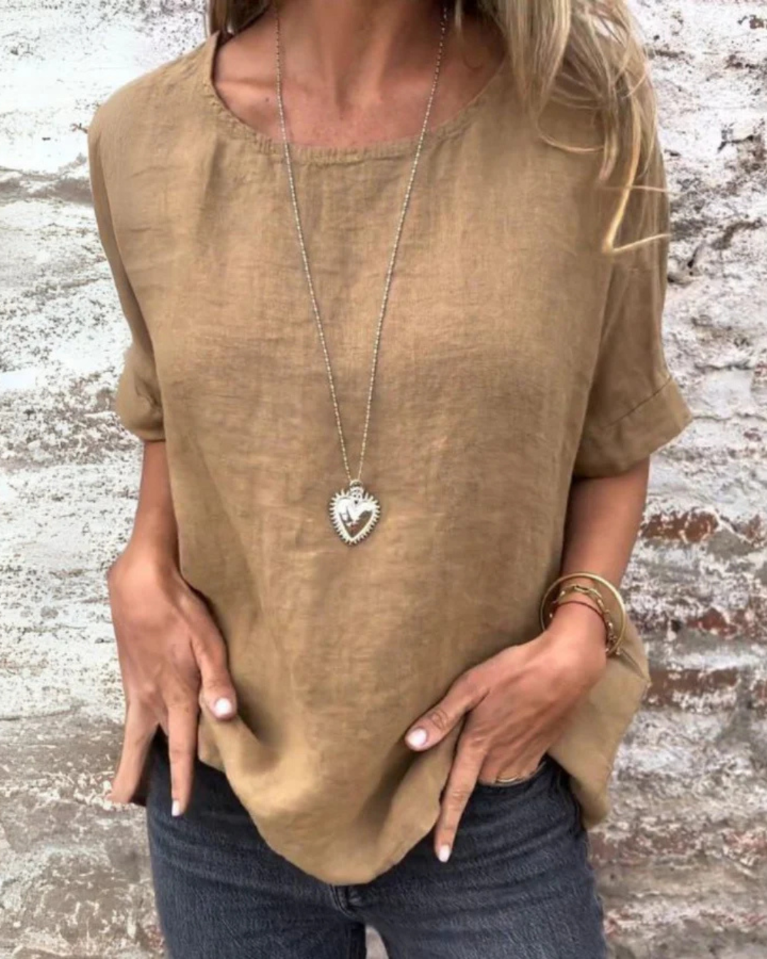 Esta T-shirt apresenta um design simples mas elegante. A gola redonda e as mangas curtas tornam-na versátil e fácil de usar em qualquer estação. Disponível em cores neutras para se adaptar ao seu estilo.