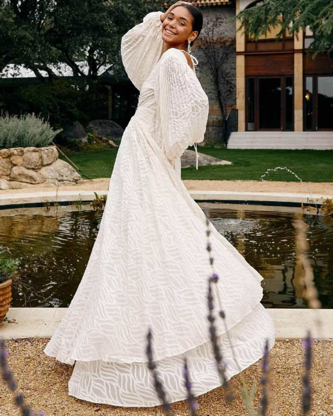 As volumosas mangas bufantes e a silhueta larga conferem-lhe uma elegância natural e etérea. O comprimento e a bainha assimétricos dão um toque dinâmico e moderno, enquanto a saia totalmente forrada proporciona conforto e cobertura. O fecho de correr oculto é prático e lisonjeador.