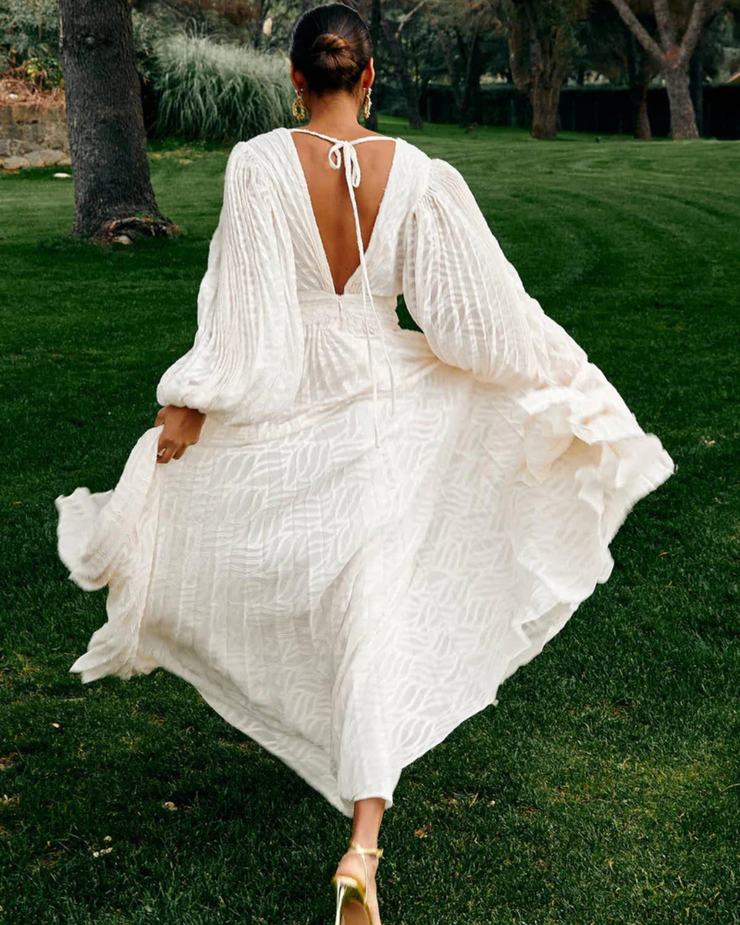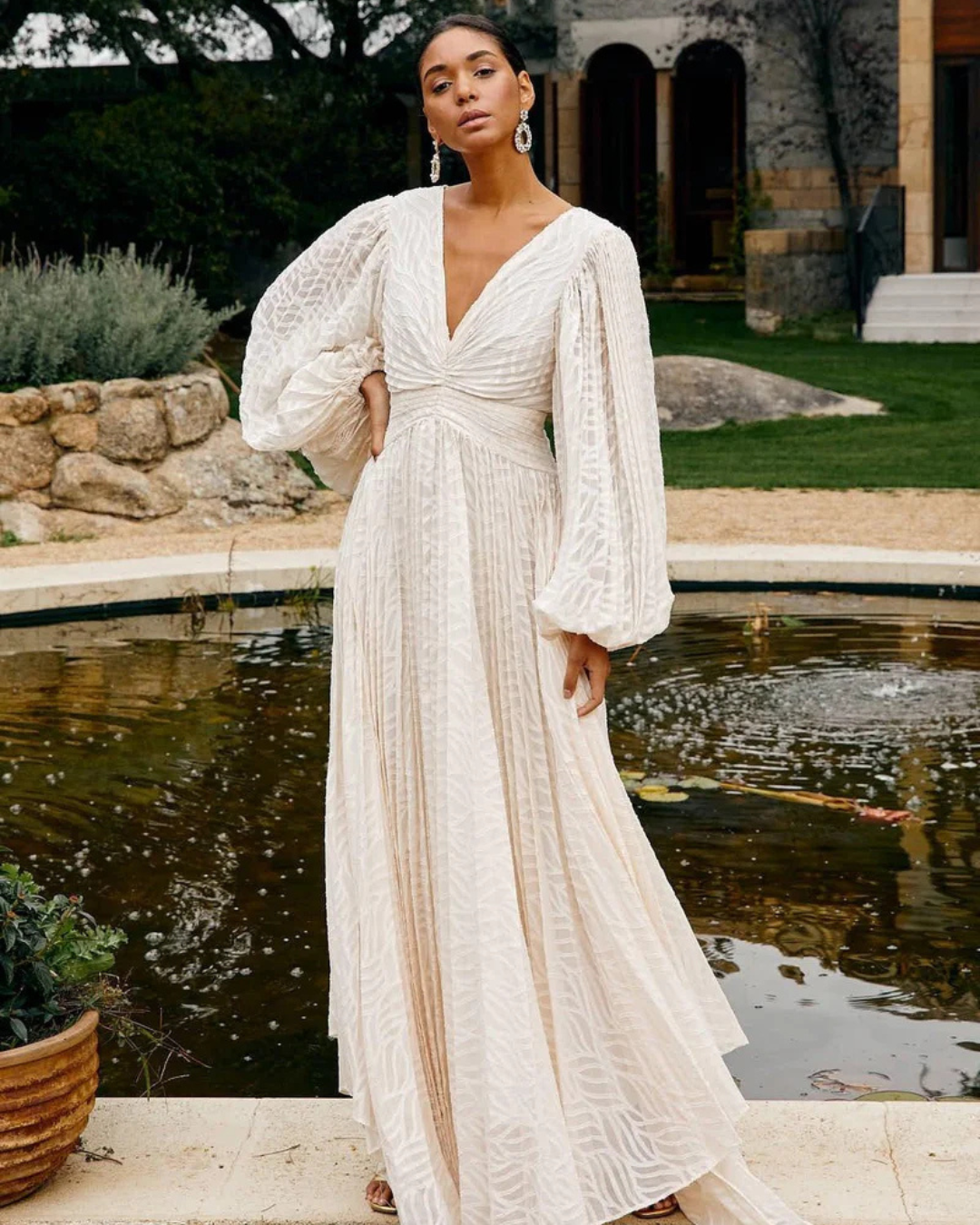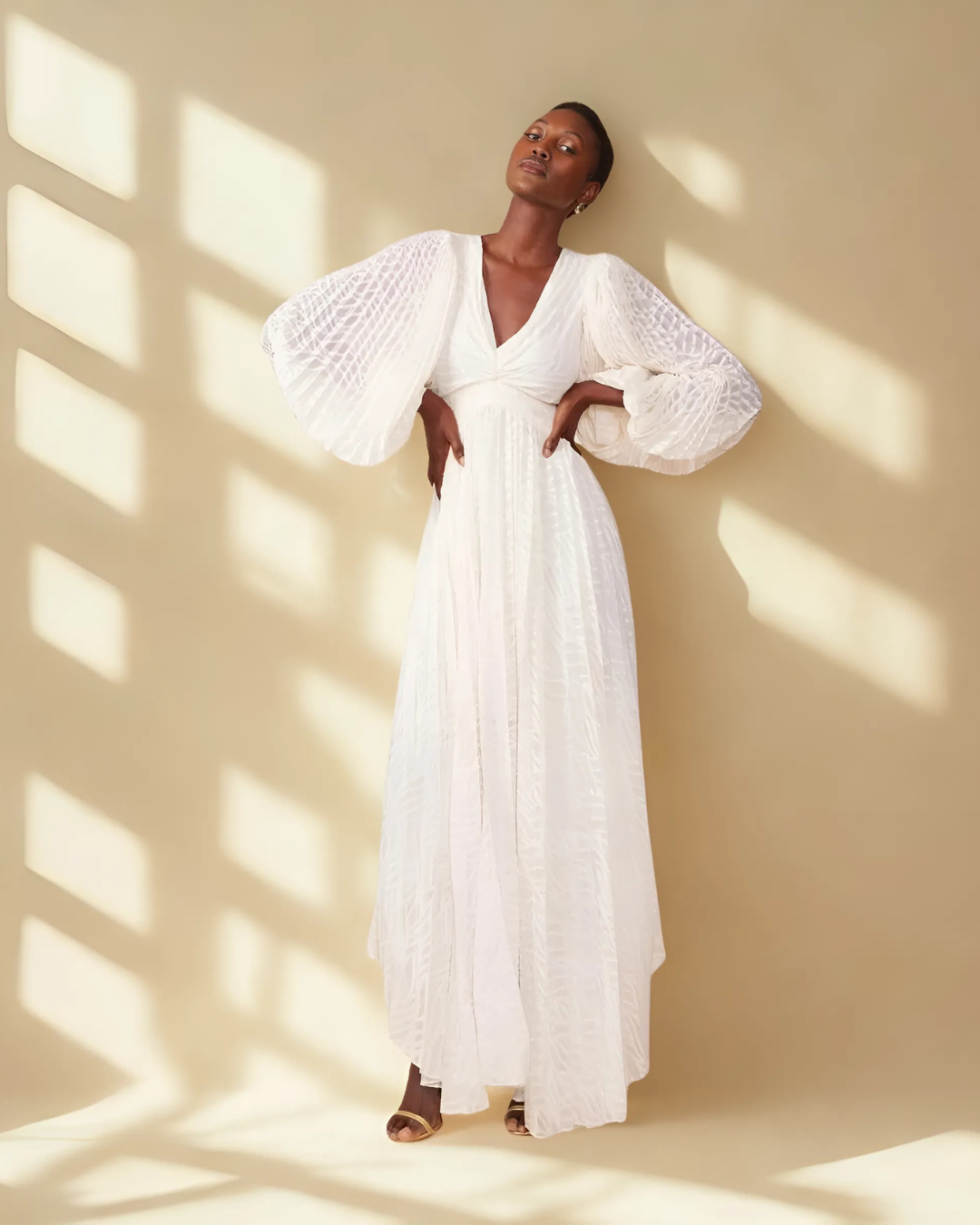 Um look inesquecível com este vestido comprido, perfeito para festas ou celebrações. Confeccionado em luxuosa musselina devoré plissada num tom branco suave, este vestido exala elegância com um toque de romance caprichoso.