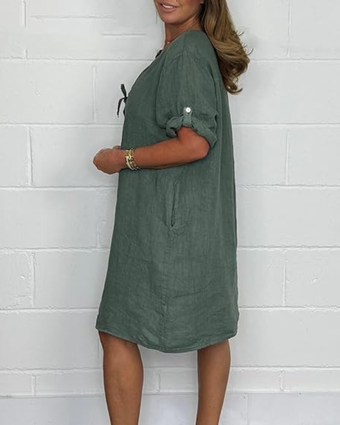 Elegância natural em cada detalhe. Confeccionado em linho fresco e respirável, este vestido combina sofisticação e conforto. Os botões frontais adicionam um toque refinado e versátil.