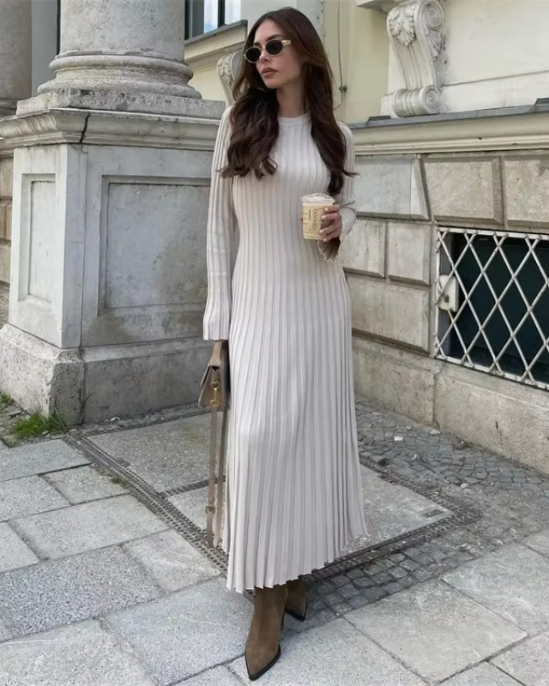 Vestido longo de malha com gola redonda e manga comprida para mulher
